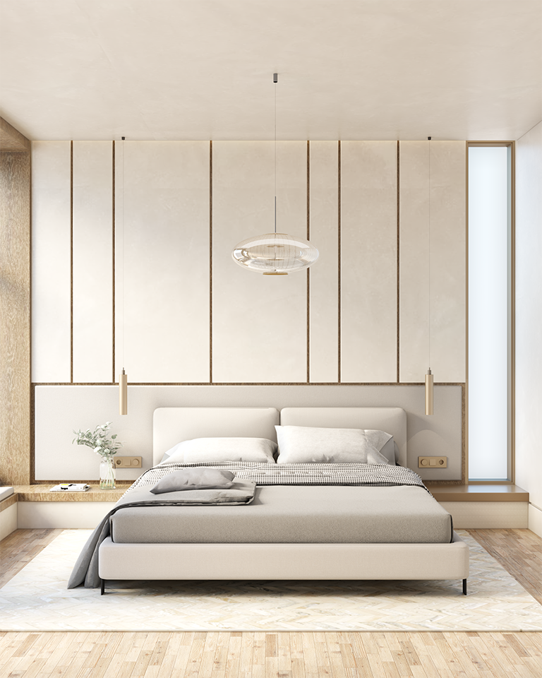 En este caso, se ha optado por un diseño en tonos cálidos y neutros que crea un ambiente tranquilo y sereno en el dormitorio. La madera como material principal se integra y complementa con el resto de materiales.